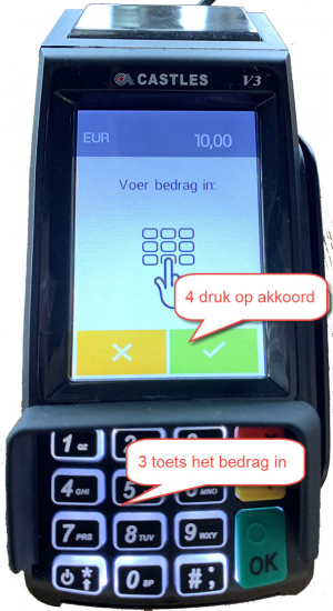 - Voer het bedrag in zonder komma. Voorbeeld: als iemand EUR 20,- wil pinnen, dan voer je 4 cijfers in: 2000